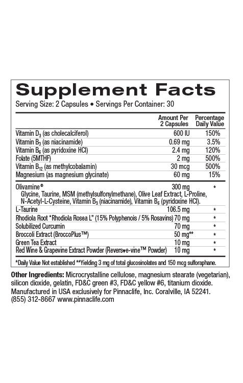 Vitamin D, folate, Vitamin B12, Magnesium, Rhodiola Rosea, Solubilized Curcumin, Broccoli Extract, Green Tea Extract, Red Wine/Grapevine Extract Powder