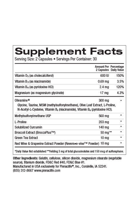Supplements Vitamin D3, Vitamin B3, Vitamin B6, and Magnesium are vital for healthy levels of inflammation. Along with Olivamine, JointHealth also includes MSM which is a natural form of organic sulfur known for its natural role in regulating inflammation, found in vegetables such as cabbage, broccoli, and cauliflower. Turmeric that is also in JointHealth, is known for its health benefits due to the antioxidant curcumin.
